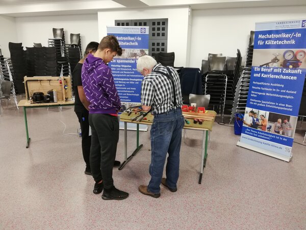 Die Landesinnung Kälte-Klima-Technik nahm wieder mit einem Informationsstand teil. Ausbildungsberater Hans-Jürgen Senge und Ulrich Münster ließen die Schülerinnen und Schüler die Bearbeitung von Kupferrohr üben. Außerdem erläuterten sie das Prinzip der "Kälteerzeugung" an einer kleinen Demonstrationsanlage.
