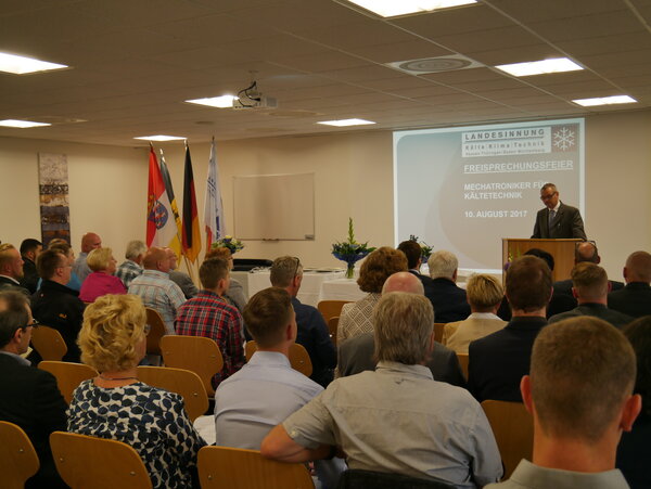 Maintal, 14. August 2017 – „Gehen Sie los und zeigen Sie, was sie können. Dass Sie es können, das haben Sie ja nun bewiesen!“ Mit diesem Zuruf endete die Grußbotschaft von Jürgen Kaul, Landesinnungsmeister der Innung Kälte-Klima-Technik Hessen-Thüringen/Baden-Württemberg. Er war gerichtet an 33 Mechatroniker für Kältetechnik, die am 10. August 2017 mit der feierlichen Lossprechung in den Gesellenstand erhoben wurden. Axel Potrikus, Vorsitzender des Gesellenprüfungsausschusses übernahm diese Zeremonie zusammen mit Rudolf Bien. Zur Feier geladen hatte die Landesinnung Kälte-Klima-Technik. Weitere Grußbotschaften gab es von Florian Schöll für die Handwerkskammer Frankfurt-Rhein-Main und von Innungsgeschäftsführer Jörg Peters. Es folgte die Übergabe der Gesellenbriefe und Auszeichnungen. Dabei wurden besonderes hervorgehoben die Kammersieger Steffen Bärsch vom Ausbildungsbetrieb Helmut Herbert, Wilhelm Bös von der Firma Entec und ‚Tripel-Gewinner’ Felix Diehl vom Unternehmen Weiss Umwelttechnik. Er hat es nämlich geschafft, gleichzeitig Prüfungsbester, Kammersieger und Landessieger Hessen 2017 zu werden. Eine grandiose Leistung. Mit passenden Liedern und Gitarrenklängen von Johannes Rosbach und einem schönen Buffet zum Ausklang fand die Freisprechungsfeier wieder einmal einen würdigen Rahmen für die Junggesellen.