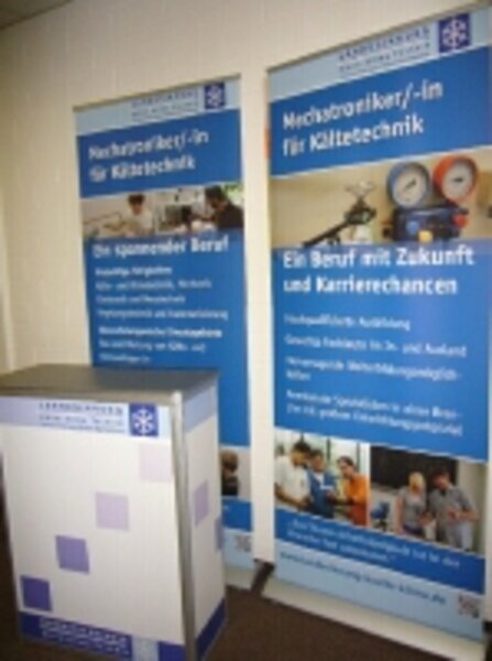Wir können den Mitgliedern der Landesinnung Kälte-Klima-Technik einen Stand, bestehend aus zwei Stellwänden und einer Theke kostenlos zur Verfügung stellen. Außerdem erhalten Sie von uns (für Innungsmitglieder ebenfalls kostenlos) Faltblätter mit Informationen zum Berufsbild des Mechatronikers für Kältetechnik.