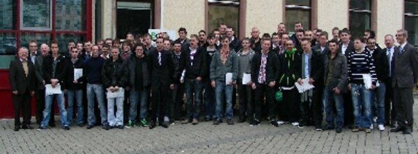 Insgesamt 65 ehemalige Auszubildende haben die Gesellenprüfung bestanden. Als Prüfungsbester wurde Herr Fabian Kaus (Fa. Weiss Umwelttechnik in Reiskirchen) vom Landesinnungsmeister Jürgen Kaul und vom Vertreter des Gesellenprüfungsausschusses, Herrn Axel Potrikus beglückwünscht.