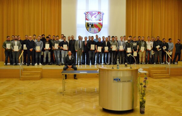 Im Beisein des Landrates des Main-Kinzig-Kreises Thosten Stolz, des Schulleiters der Beruflichen Schulen Gelnhausen Hartmut Bieber übergaben Obermeister Jürgen Kaul sowie Axel Potrikus und Rudi Bien die Gesellenbriefe.