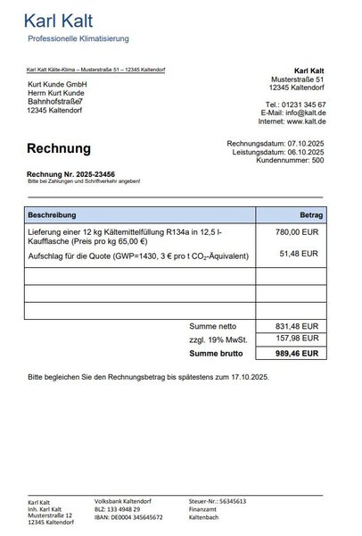 Die Zahlung von 3 Euro/t CO2-Äquivalent muss von Ihnen nicht gesondert ausgewiesen werden. Sie ist von den Quoteninhabern – also den Kältemittelherstellern und -importeuren – an die EU-Kommission zu entrichten. Dies betrifft vor allem die Kältemittelhändler, die die Mehrkosten an die Kunden – also die Fachbetriebe – weiterreichen. Dies muss aber von den Händlern nicht zwingend extra ausgewiesen werden. Manche werden dies tun, andere wiederum nicht. Es schadet aber sicher nicht, wenn Sie die Mehrkosten Ihren Kunden gegenüber kommunizieren, weil Sie damit eine Preiserhöhung logisch erklären können.