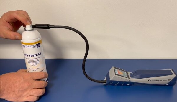 Wir empfehlen, dass die Lecksuchgeräte vor jedem Einsatz auf ihre Funktionsfähigkeit getestet werden. Wenn unterschiedliche Kältemittel zum Einsatz kommen, müssen für jede Kältemittelsorte zusätzlich zum Lecksuchgerät auch Testlecks mitgeführt werden. Um diesen Aufwand zu minimieren, hat die Bundesfachschule Kälte-Klima-Technik ein Testgas entwickelt, welches zur Überprüfung unterschiedlicher Lecksuchgeräte eingesetzt werden kann.